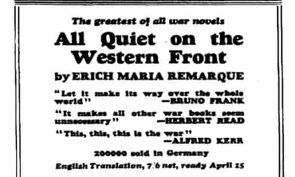 All Quiet On The Western Front Becomes Instant Bestseller Archive 1929 First World War The Guardian